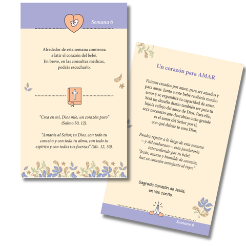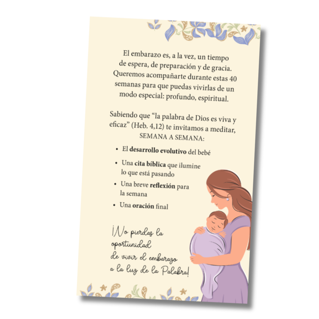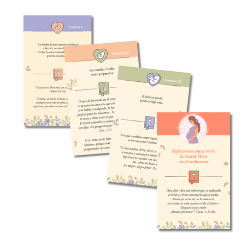 - 8 tarjetas adicionales (Nacimiento, Amamantamiento, Puerperio, Bautismo, Consagración a María, pérdida del hijo, cómo vivir la Santa Misa, cómo vivir el embarazo según el tiempo litúrgico)